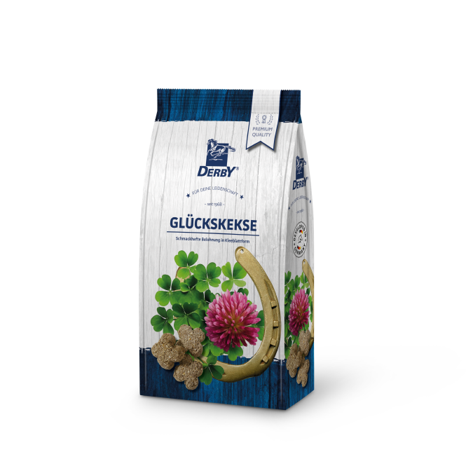 DERBY® Glückskekse – gardumi āboliņa lapas formā ir garda ikdienas balva katram zirgam. Pateicoties īpašai ražošanas metodei, tie ir augsti apstrādāti un viegli sagremojami.
